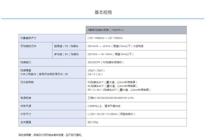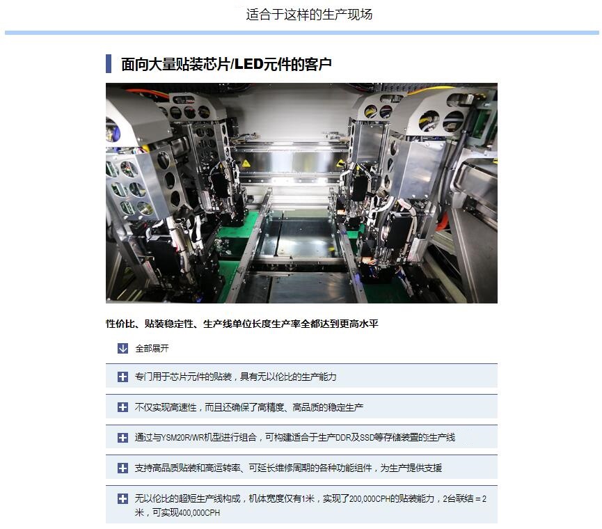 Z:TA-R YSM40R超高速模塊貼片機 1.采用小巧的平臺構造,達成了世界更高水平的貼裝速度20萬CPH※,實現了生產率的全面革新。2.全球更高生產率。3.靈活支持多種生產形態。4.支持高品質貼裝和高運轉率的技術?!号c4橫梁/4貼裝頭的同級別貼片機在更佳條件下的貼裝能力(CPH)對比?;?016年4月本公司的調查結果。
