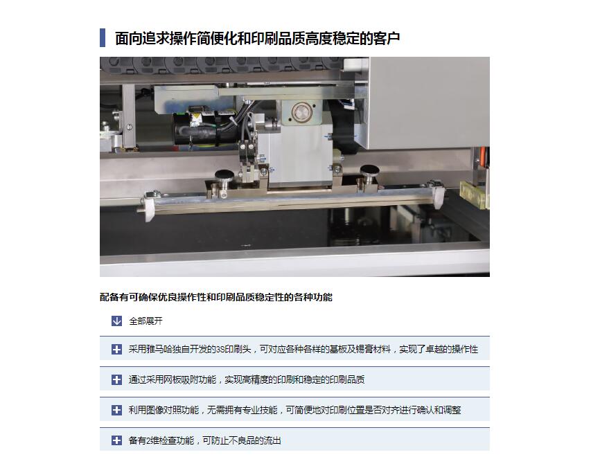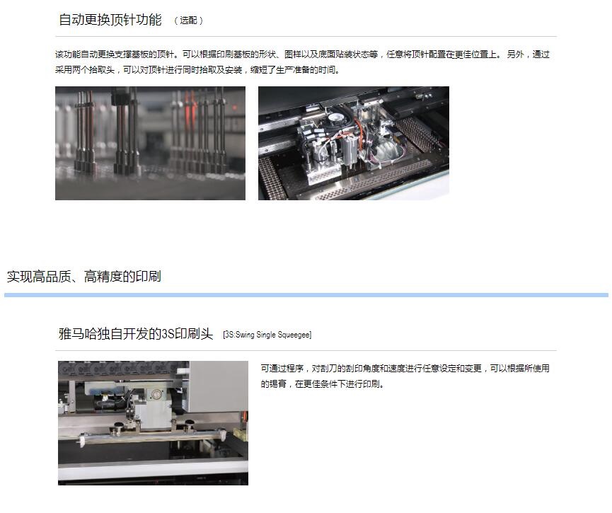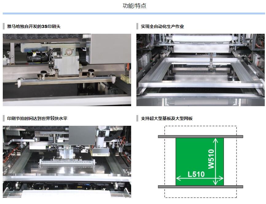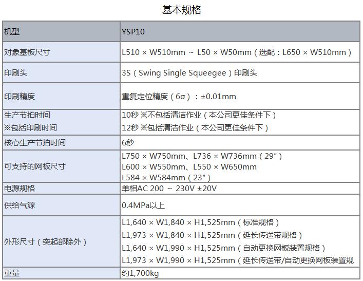 YSP10 高端印刷機(jī)1.印刷節(jié)拍時間達(dá)到世界更快水平,實現(xiàn)全自動化生產(chǎn)作業(yè)。2.超高速印刷性能 包括網(wǎng)板清潔作業(yè):12sec/cycle / 10sec/cycle3.重復(fù)定位精度:6σ : ±0.01mm4.支持大型基板:L510 x W510mm [選購品: L650 x W510mm]5.網(wǎng)板尺寸:MAX.750×750mm